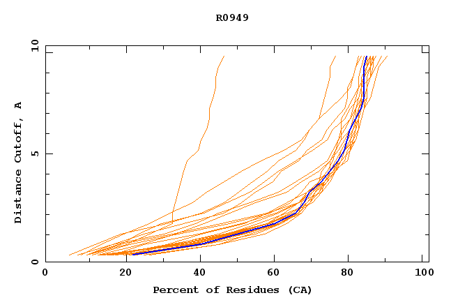 GDT analysis: largest set of CA atoms (percent of the modeled structure) that can fit under DISTANCE cutoff: 0.5A, 1.0A, 1.5A, ... , 10.0A