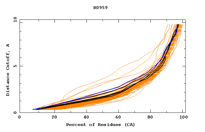 GDT analysis: largest set of CA atoms (percent of the modeled structure) that can fit under DISTANCE cutoff: 0.5A, 1.0A, 1.5A, ... , 10.0A