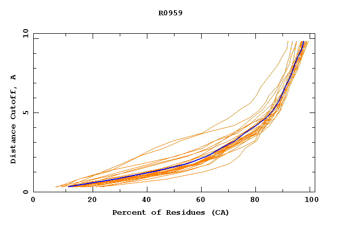GDT analysis: largest set of CA atoms (percent of the modeled structure) that can fit under DISTANCE cutoff: 0.5A, 1.0A, 1.5A, ... , 10.0A