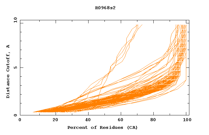 GDT analysis: largest set of CA atoms (percent of the modeled structure) that can fit under DISTANCE cutoff: 0.5A, 1.0A, 1.5A, ... , 10.0A