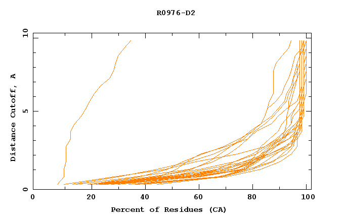 GDT analysis: largest set of CA atoms (percent of the modeled structure) that can fit under DISTANCE cutoff: 0.5A, 1.0A, 1.5A, ... , 10.0A