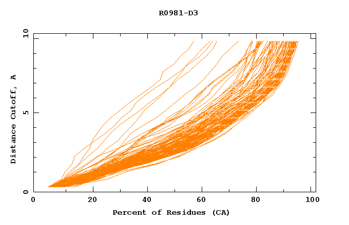 GDT analysis: largest set of CA atoms (percent of the modeled structure) that can fit under DISTANCE cutoff: 0.5A, 1.0A, 1.5A, ... , 10.0A