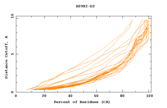 GDT analysis: largest set of CA atoms (percent of the modeled structure) that can fit under DISTANCE cutoff: 0.5A, 1.0A, 1.5A, ... , 10.0A