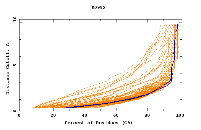 GDT analysis: largest set of CA atoms (percent of the modeled structure) that can fit under DISTANCE cutoff: 0.5A, 1.0A, 1.5A, ... , 10.0A