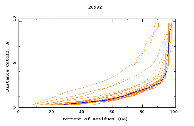 GDT analysis: largest set of CA atoms (percent of the modeled structure) that can fit under DISTANCE cutoff: 0.5A, 1.0A, 1.5A, ... , 10.0A