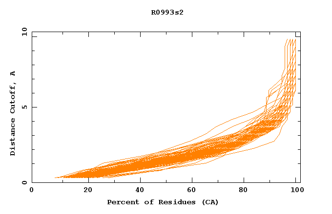 GDT analysis: largest set of CA atoms (percent of the modeled structure) that can fit under DISTANCE cutoff: 0.5A, 1.0A, 1.5A, ... , 10.0A