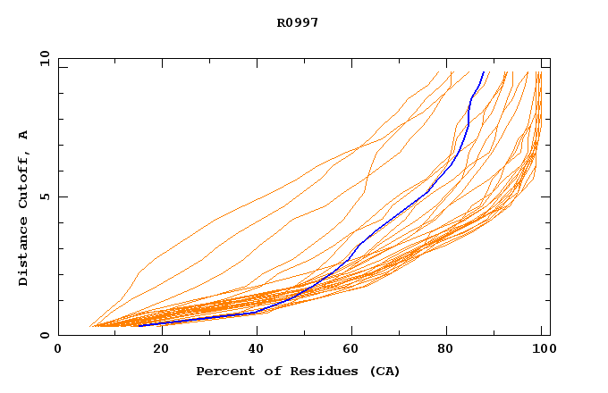 GDT analysis: largest set of CA atoms (percent of the modeled structure) that can fit under DISTANCE cutoff: 0.5A, 1.0A, 1.5A, ... , 10.0A