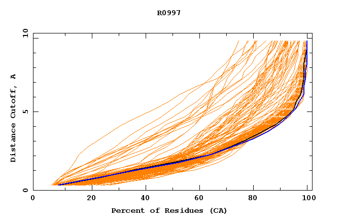 GDT analysis: largest set of CA atoms (percent of the modeled structure) that can fit under DISTANCE cutoff: 0.5A, 1.0A, 1.5A, ... , 10.0A