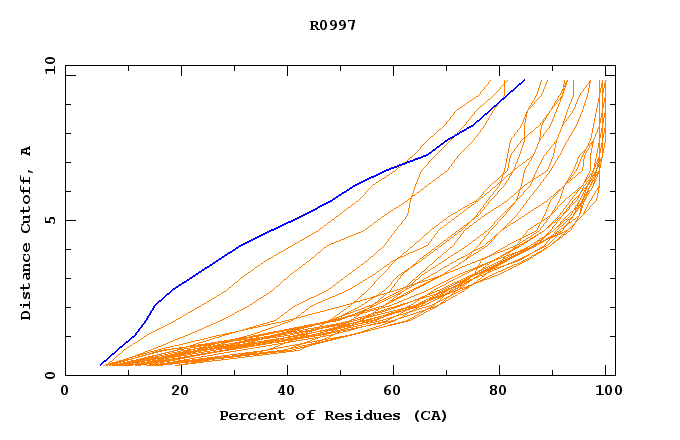 GDT analysis: largest set of CA atoms (percent of the modeled structure) that can fit under DISTANCE cutoff: 0.5A, 1.0A, 1.5A, ... , 10.0A