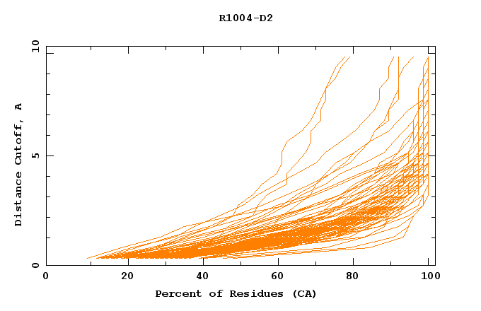 GDT analysis: largest set of CA atoms (percent of the modeled structure) that can fit under DISTANCE cutoff: 0.5A, 1.0A, 1.5A, ... , 10.0A