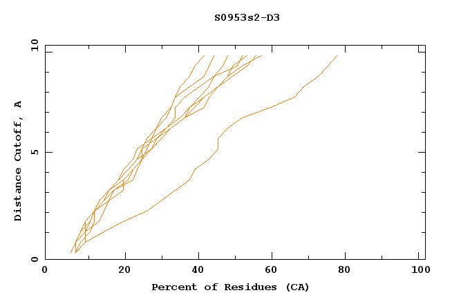 GDT analysis: largest set of CA atoms (percent of the modeled structure) that can fit under DISTANCE cutoff: 0.5A, 1.0A, 1.5A, ... , 10.0A