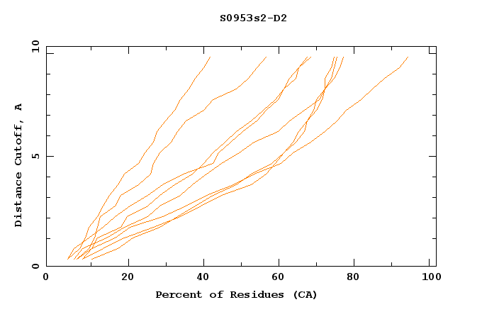 GDT analysis: largest set of CA atoms (percent of the modeled structure) that can fit under DISTANCE cutoff: 0.5A, 1.0A, 1.5A, ... , 10.0A
