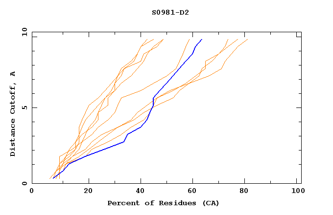 GDT analysis: largest set of CA atoms (percent of the modeled structure) that can fit under DISTANCE cutoff: 0.5A, 1.0A, 1.5A, ... , 10.0A