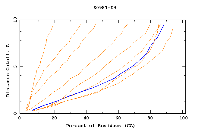 GDT analysis: largest set of CA atoms (percent of the modeled structure) that can fit under DISTANCE cutoff: 0.5A, 1.0A, 1.5A, ... , 10.0A