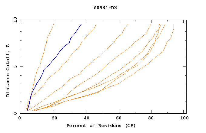 GDT analysis: largest set of CA atoms (percent of the modeled structure) that can fit under DISTANCE cutoff: 0.5A, 1.0A, 1.5A, ... , 10.0A