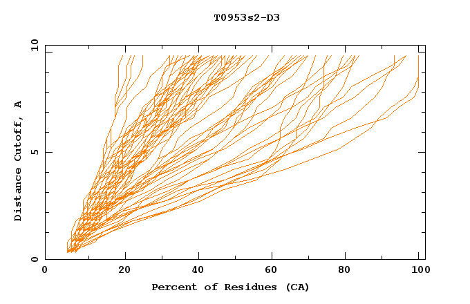 GDT analysis: largest set of CA atoms (percent of the modeled structure) that can fit under DISTANCE cutoff: 0.5A, 1.0A, 1.5A, ... , 10.0A