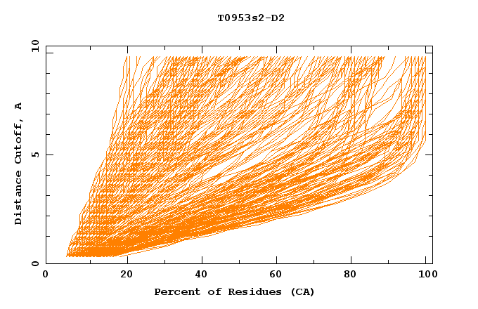 GDT analysis: largest set of CA atoms (percent of the modeled structure) that can fit under DISTANCE cutoff: 0.5A, 1.0A, 1.5A, ... , 10.0A