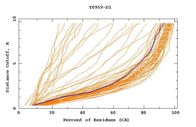 GDT analysis: largest set of CA atoms (percent of the modeled structure) that can fit under DISTANCE cutoff: 0.5A, 1.0A, 1.5A, ... , 10.0A