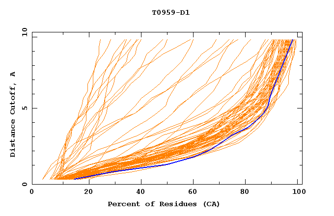 GDT analysis: largest set of CA atoms (percent of the modeled structure) that can fit under DISTANCE cutoff: 0.5A, 1.0A, 1.5A, ... , 10.0A