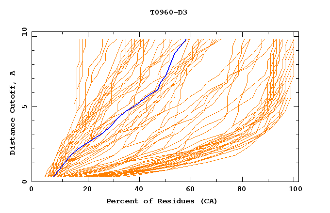 GDT analysis: largest set of CA atoms (percent of the modeled structure) that can fit under DISTANCE cutoff: 0.5A, 1.0A, 1.5A, ... , 10.0A