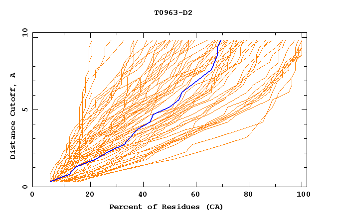 GDT analysis: largest set of CA atoms (percent of the modeled structure) that can fit under DISTANCE cutoff: 0.5A, 1.0A, 1.5A, ... , 10.0A