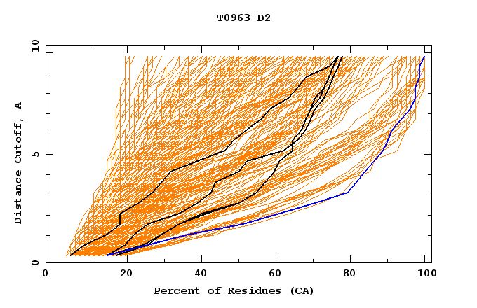 GDT analysis: largest set of CA atoms (percent of the modeled structure) that can fit under DISTANCE cutoff: 0.5A, 1.0A, 1.5A, ... , 10.0A