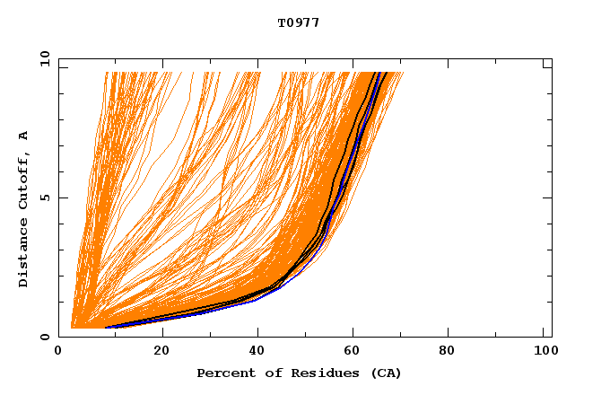 GDT analysis: largest set of CA atoms (percent of the modeled structure) that can fit under DISTANCE cutoff: 0.5A, 1.0A, 1.5A, ... , 10.0A