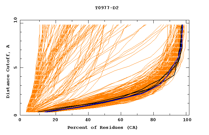 GDT analysis: largest set of CA atoms (percent of the modeled structure) that can fit under DISTANCE cutoff: 0.5A, 1.0A, 1.5A, ... , 10.0A
