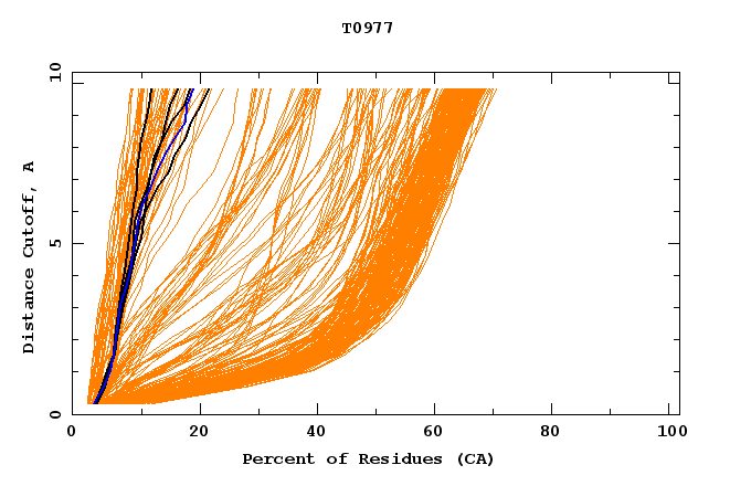 GDT analysis: largest set of CA atoms (percent of the modeled structure) that can fit under DISTANCE cutoff: 0.5A, 1.0A, 1.5A, ... , 10.0A