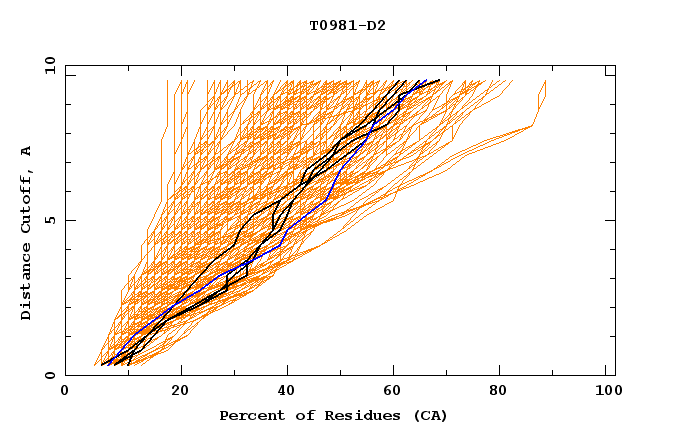 GDT analysis: largest set of CA atoms (percent of the modeled structure) that can fit under DISTANCE cutoff: 0.5A, 1.0A, 1.5A, ... , 10.0A