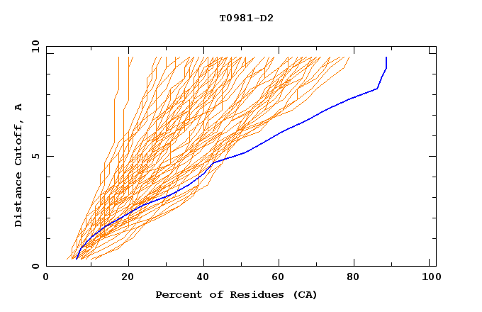 GDT analysis: largest set of CA atoms (percent of the modeled structure) that can fit under DISTANCE cutoff: 0.5A, 1.0A, 1.5A, ... , 10.0A