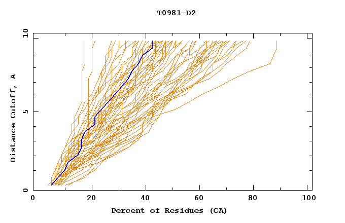 GDT analysis: largest set of CA atoms (percent of the modeled structure) that can fit under DISTANCE cutoff: 0.5A, 1.0A, 1.5A, ... , 10.0A