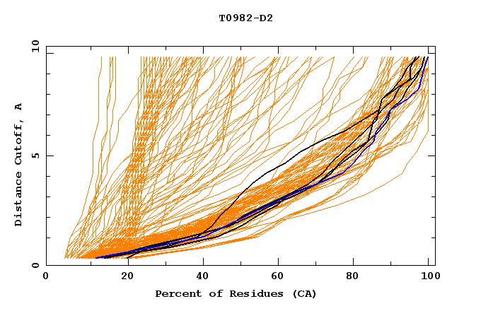 GDT analysis: largest set of CA atoms (percent of the modeled structure) that can fit under DISTANCE cutoff: 0.5A, 1.0A, 1.5A, ... , 10.0A