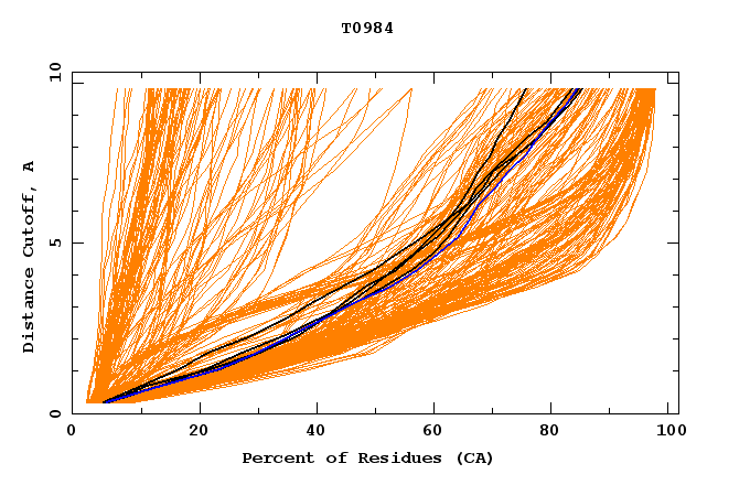 GDT analysis: largest set of CA atoms (percent of the modeled structure) that can fit under DISTANCE cutoff: 0.5A, 1.0A, 1.5A, ... , 10.0A