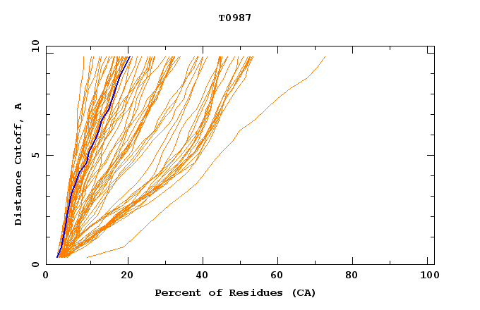GDT analysis: largest set of CA atoms (percent of the modeled structure) that can fit under DISTANCE cutoff: 0.5A, 1.0A, 1.5A, ... , 10.0A