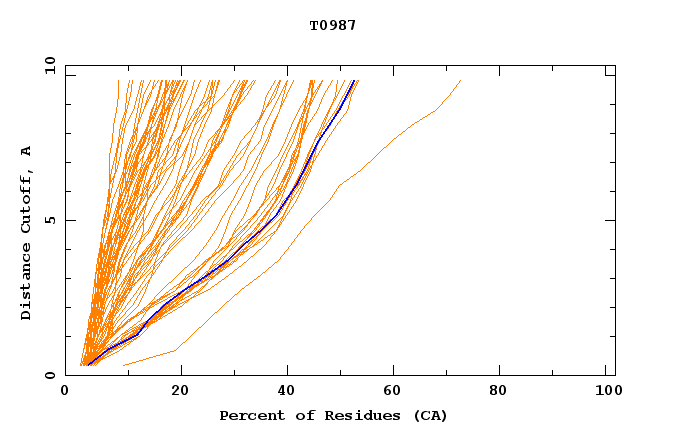 GDT analysis: largest set of CA atoms (percent of the modeled structure) that can fit under DISTANCE cutoff: 0.5A, 1.0A, 1.5A, ... , 10.0A