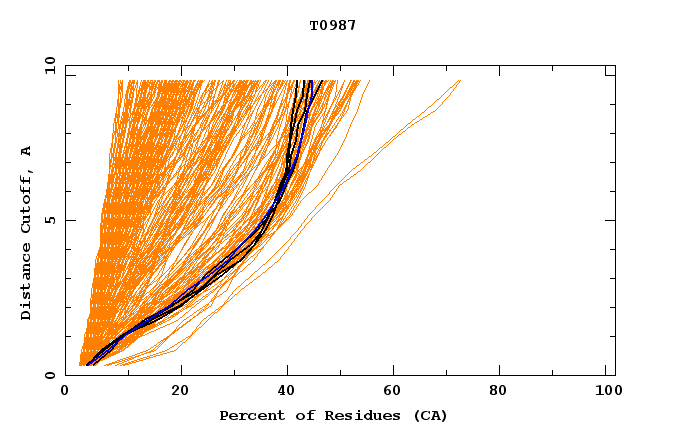 GDT analysis: largest set of CA atoms (percent of the modeled structure) that can fit under DISTANCE cutoff: 0.5A, 1.0A, 1.5A, ... , 10.0A