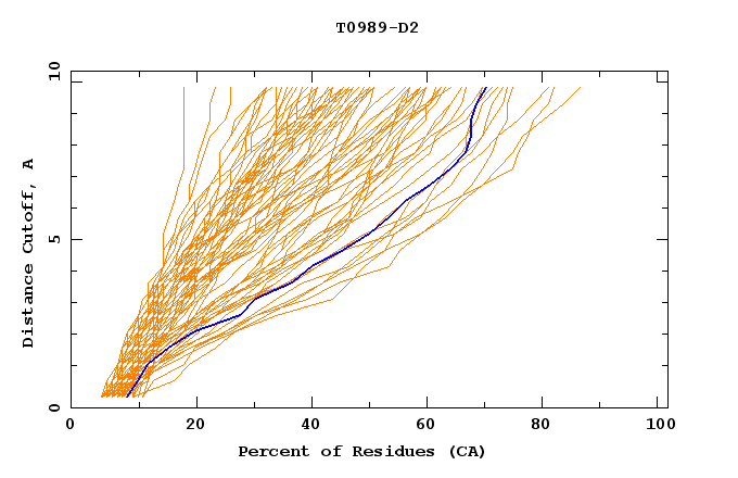 GDT analysis: largest set of CA atoms (percent of the modeled structure) that can fit under DISTANCE cutoff: 0.5A, 1.0A, 1.5A, ... , 10.0A