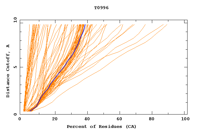 GDT analysis: largest set of CA atoms (percent of the modeled structure) that can fit under DISTANCE cutoff: 0.5A, 1.0A, 1.5A, ... , 10.0A