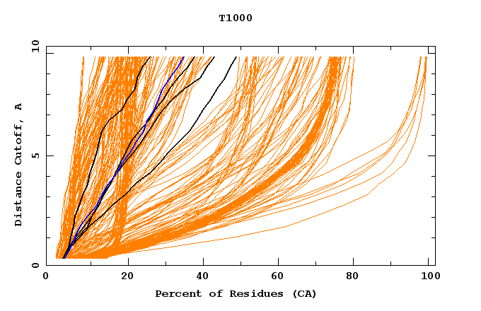 GDT analysis: largest set of CA atoms (percent of the modeled structure) that can fit under DISTANCE cutoff: 0.5A, 1.0A, 1.5A, ... , 10.0A
