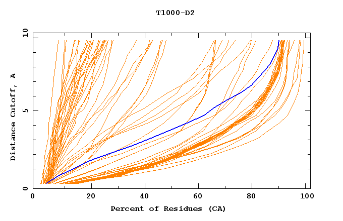 GDT analysis: largest set of CA atoms (percent of the modeled structure) that can fit under DISTANCE cutoff: 0.5A, 1.0A, 1.5A, ... , 10.0A