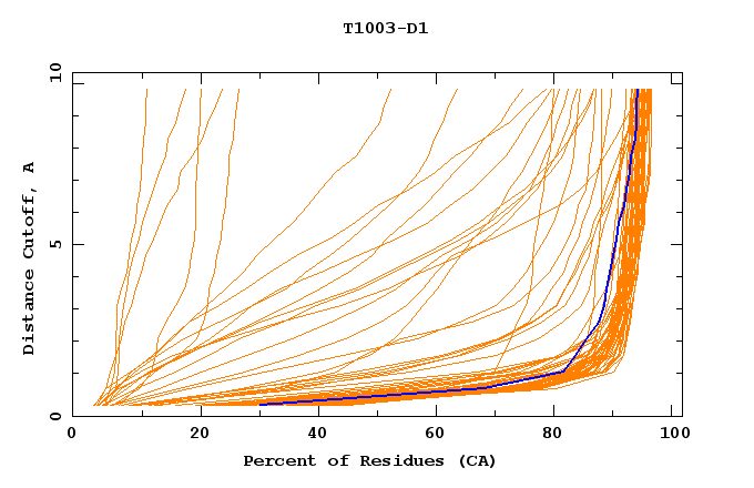 GDT analysis: largest set of CA atoms (percent of the modeled structure) that can fit under DISTANCE cutoff: 0.5A, 1.0A, 1.5A, ... , 10.0A