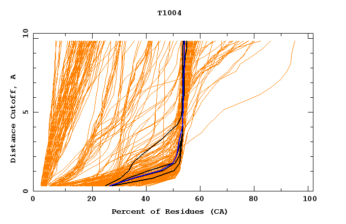 GDT analysis: largest set of CA atoms (percent of the modeled structure) that can fit under DISTANCE cutoff: 0.5A, 1.0A, 1.5A, ... , 10.0A