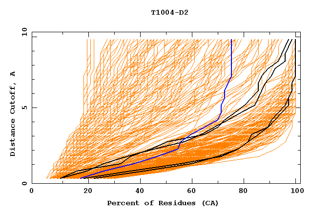 GDT analysis: largest set of CA atoms (percent of the modeled structure) that can fit under DISTANCE cutoff: 0.5A, 1.0A, 1.5A, ... , 10.0A