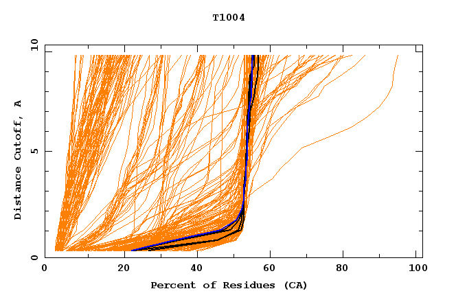 GDT analysis: largest set of CA atoms (percent of the modeled structure) that can fit under DISTANCE cutoff: 0.5A, 1.0A, 1.5A, ... , 10.0A