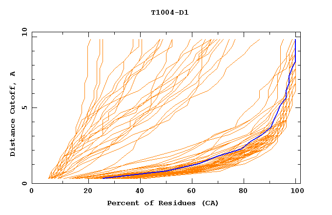GDT analysis: largest set of CA atoms (percent of the modeled structure) that can fit under DISTANCE cutoff: 0.5A, 1.0A, 1.5A, ... , 10.0A