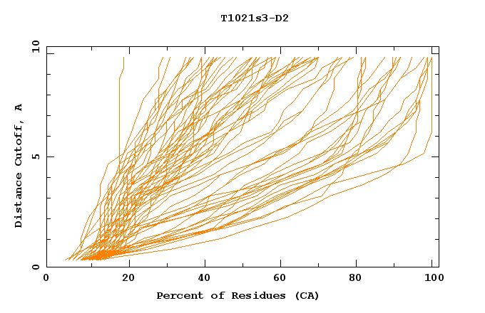 GDT analysis: largest set of CA atoms (percent of the modeled structure) that can fit under DISTANCE cutoff: 0.5A, 1.0A, 1.5A, ... , 10.0A