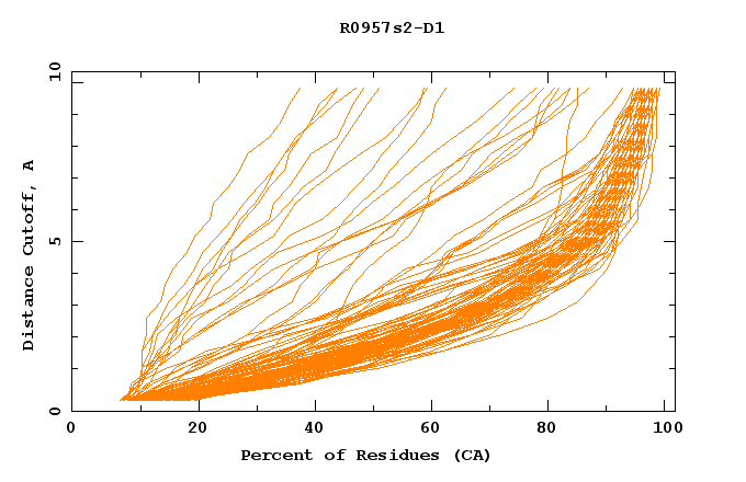 GDT analysis: largest set of CA atoms (percent of the modeled structure) that can fit under DISTANCE cutoff: 0.5A, 1.0A, 1.5A, ... , 10.0A