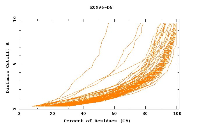 GDT analysis: largest set of CA atoms (percent of the modeled structure) that can fit under DISTANCE cutoff: 0.5A, 1.0A, 1.5A, ... , 10.0A