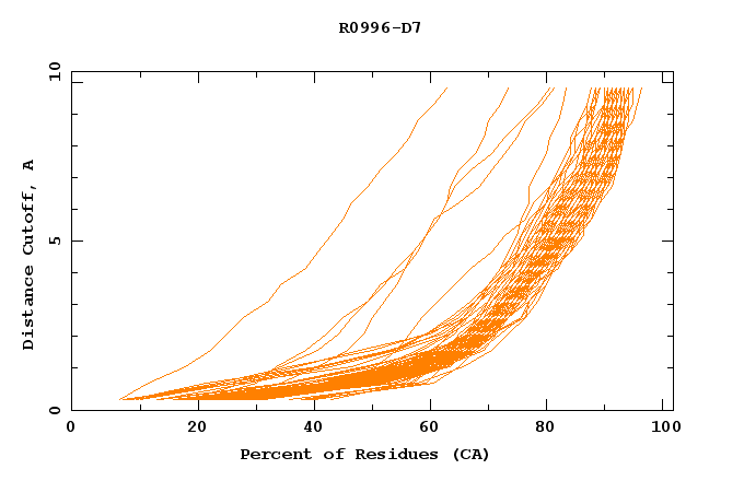 GDT analysis: largest set of CA atoms (percent of the modeled structure) that can fit under DISTANCE cutoff: 0.5A, 1.0A, 1.5A, ... , 10.0A